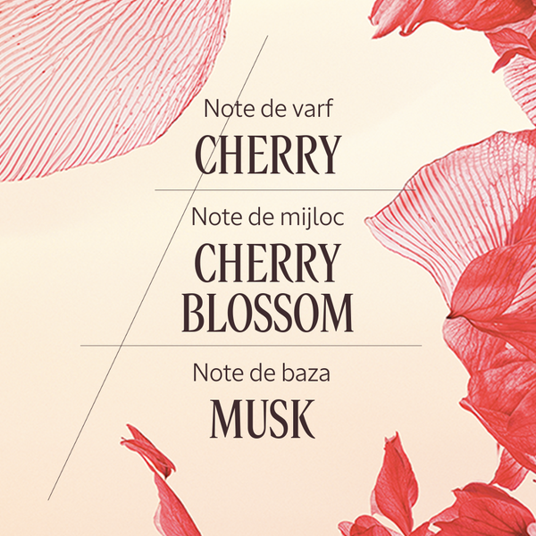Aceasta apa de toaleta floral-fructata te poarta pe colinele presarate cu ciresi din sudul Frantei, prin parfumul sau delicat si proaspat. Un parfum feminin, creat cu extract de cires din regiunea Luberon din Provence. Rasfata-ti simturile cu note de frezie, floare de cires si lacramioare, completate de o baza calda de ambra si mosc, care persista delicat pe piele. Pulverizeaza pe punctele de puls ale corpului – gat, piept si incheieturi. Pentru cele mai bune rezultate, aplica apa de toaleta dupa folosirea lotiunii de corp Cherry Blossom Shimmering cu particule stralucitoare.