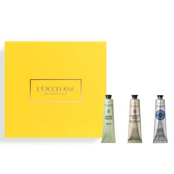 Trei formule iconice pentru ingrijirea completa a mainilor, intr-un set perfect pentru rasfat sau cadou. Crema de maini cu migdale catifeleaza si hidrateaza cu o aroma delicata, crema cu 20% Unt de Shea hraneste intens si protejeaza, iar serul Immortelle Divine ajuta la diminuarea semnelor vizibile ale imbatranirii, pentru maini mai netede si mai luminoase.